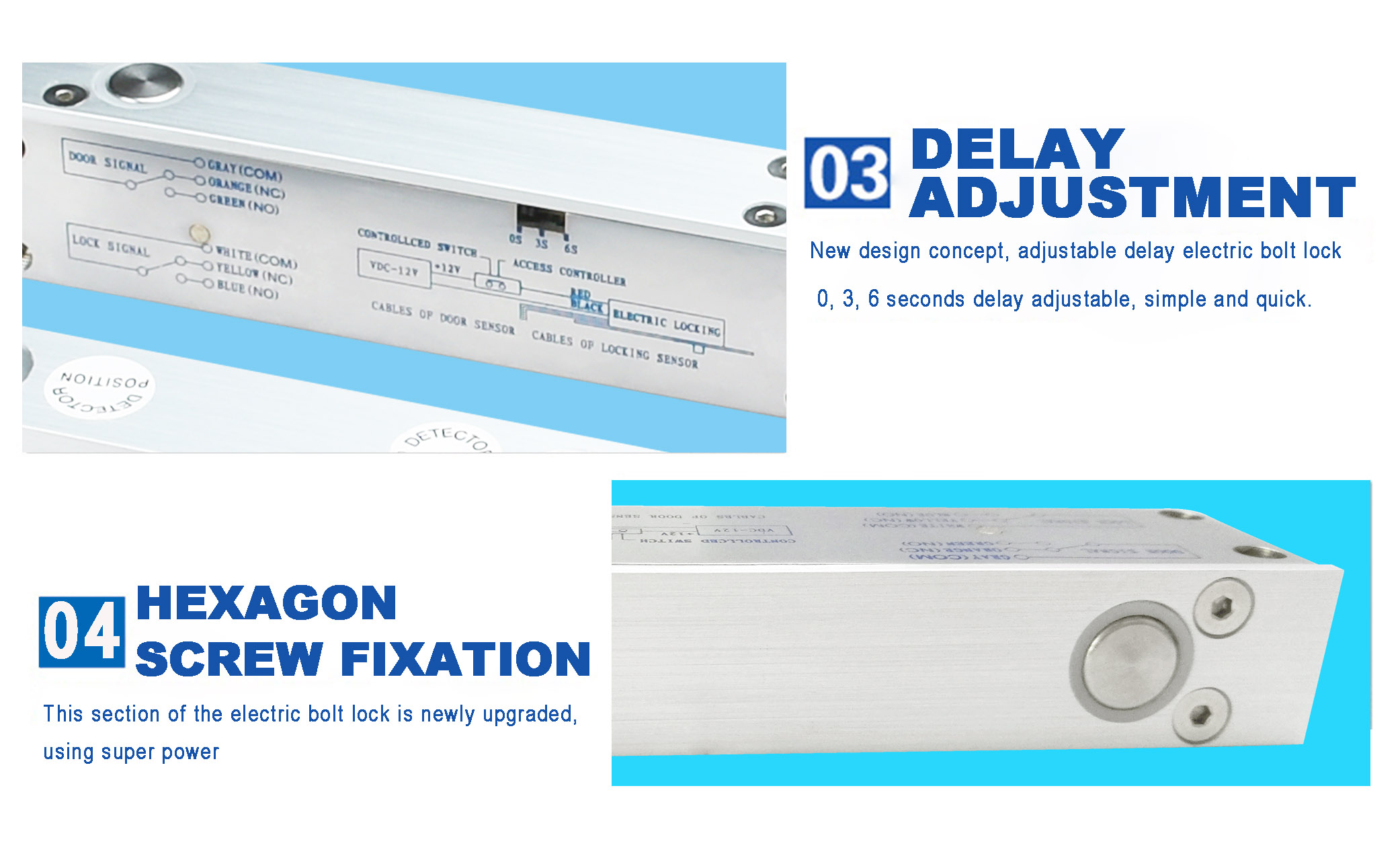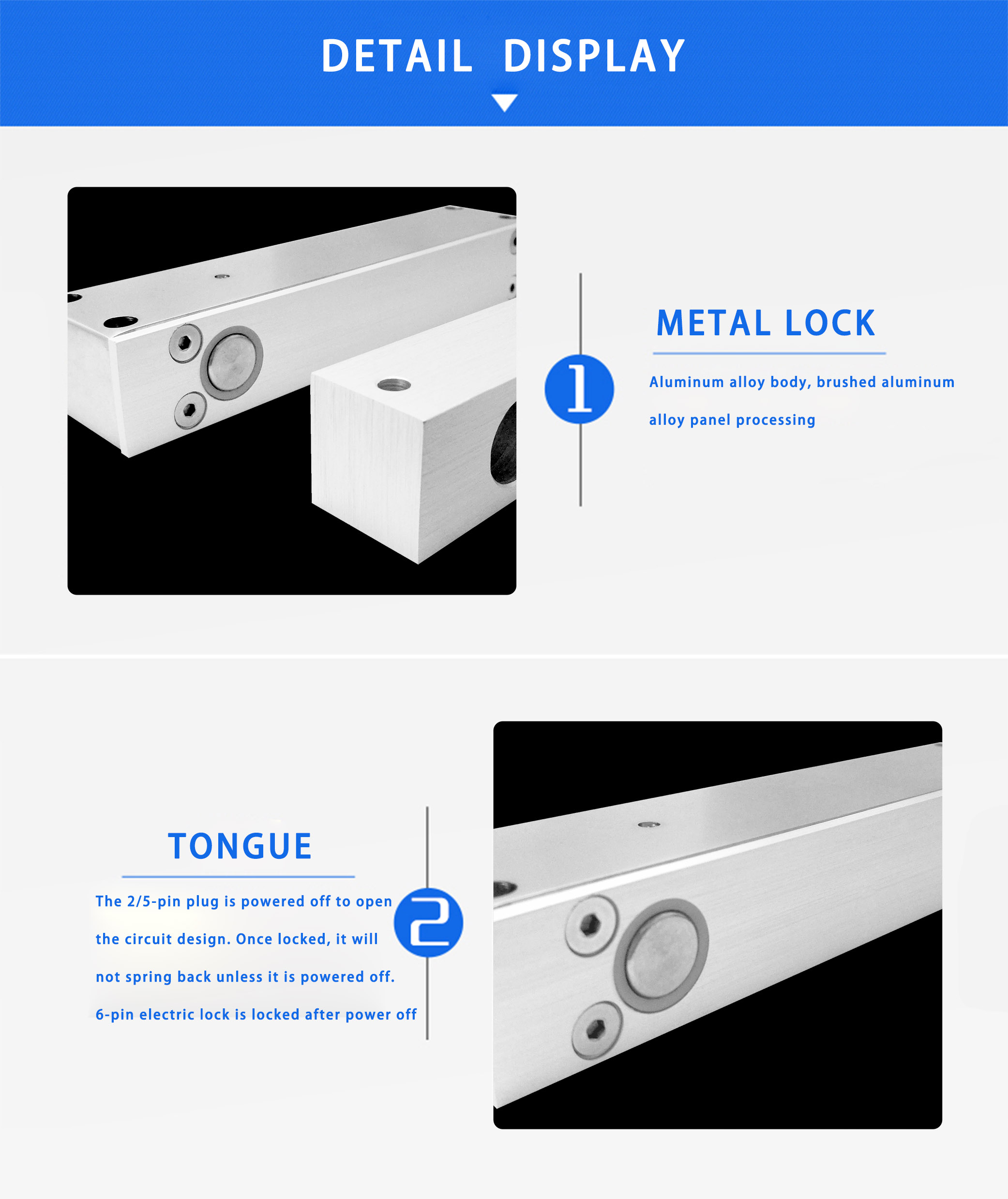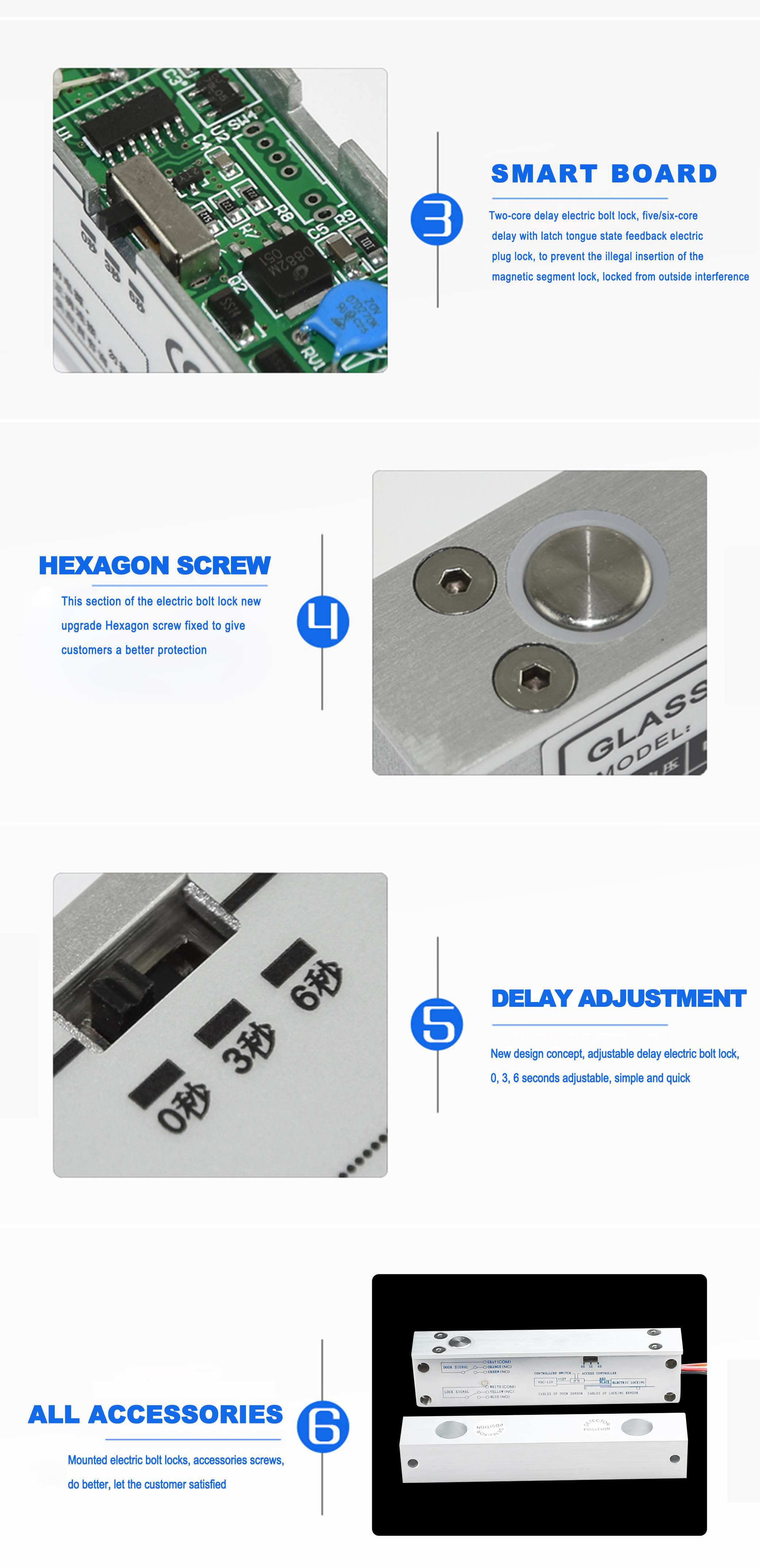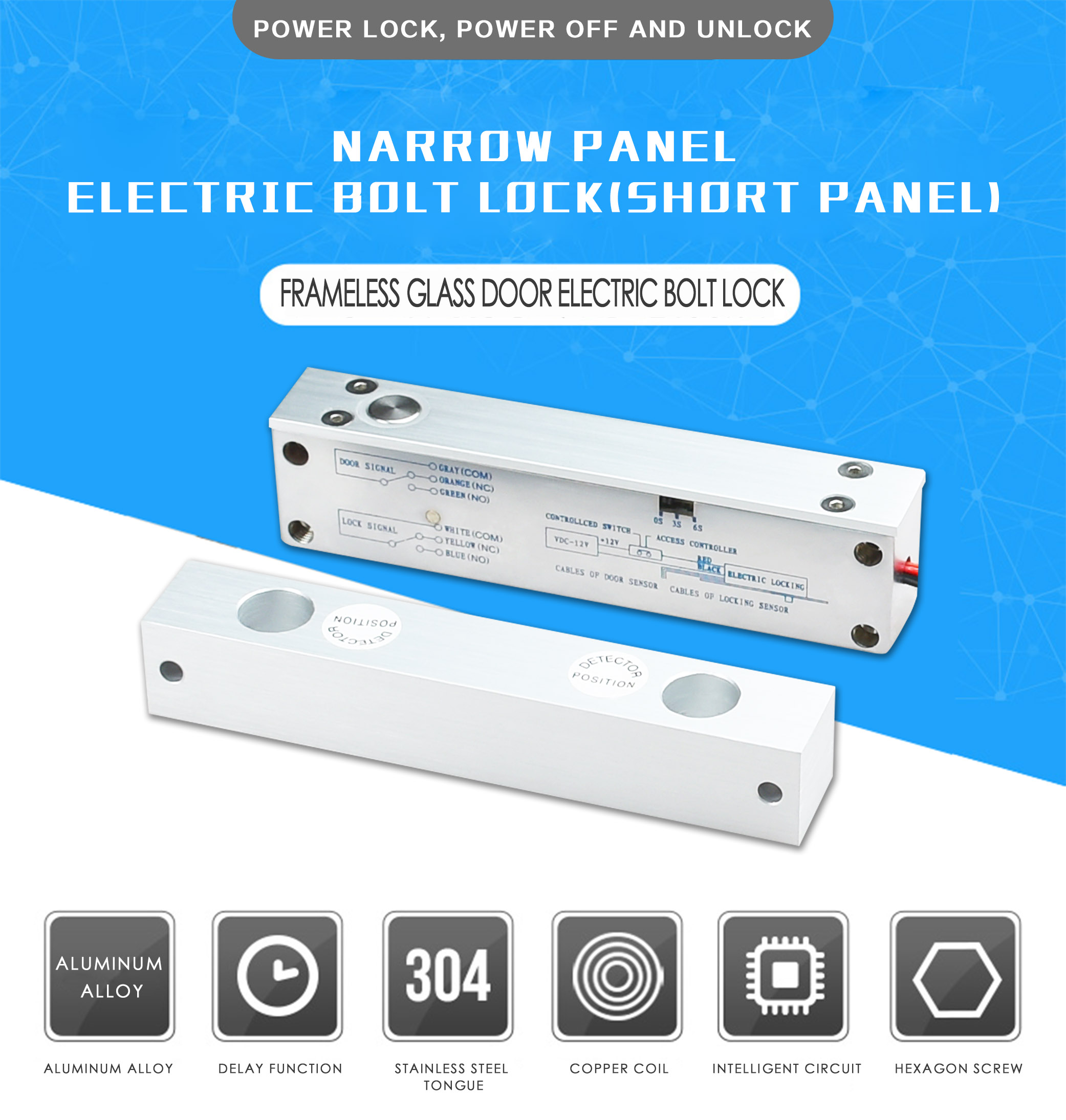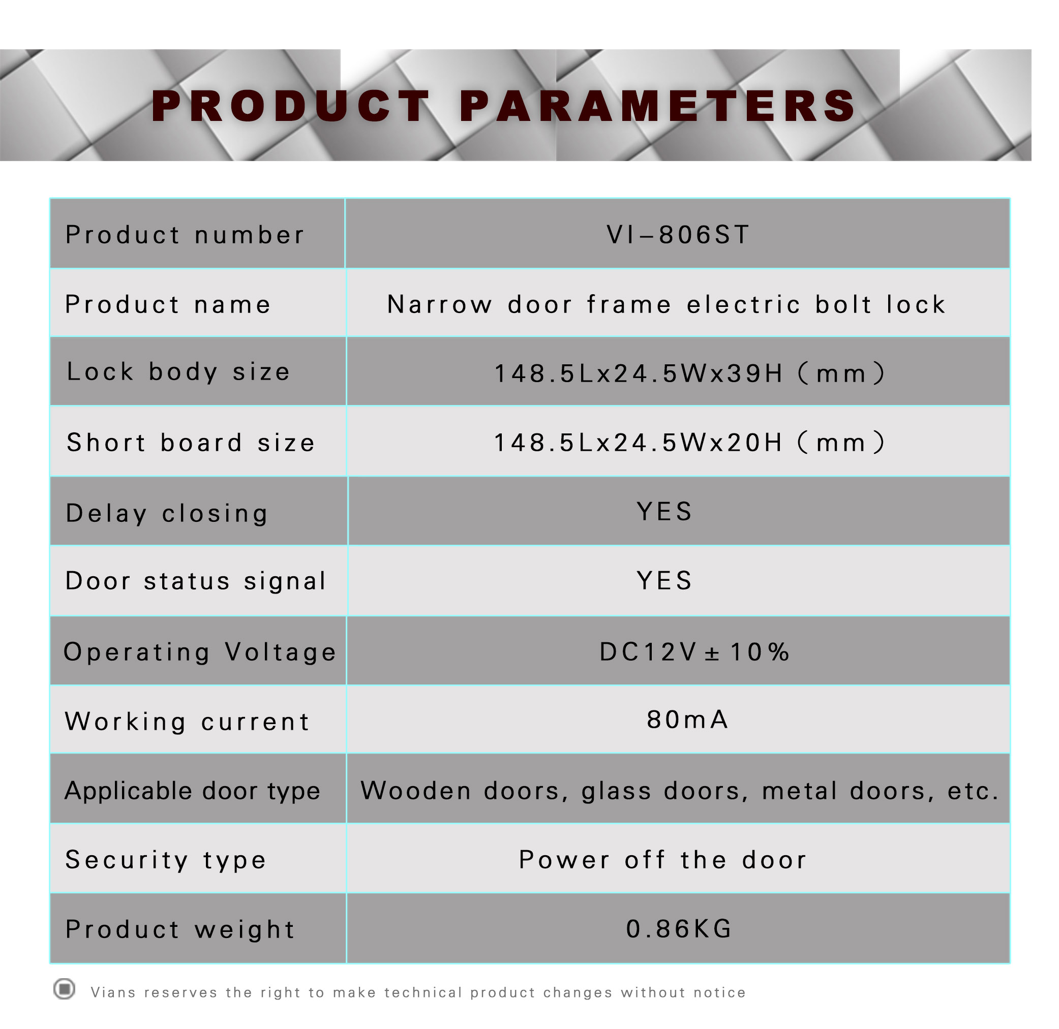 The VIANS Electric Bolt lock use the microprocessor chip to control electric circuit, so it decreases the power consumption and really has the ultralow temperature function. After 500 000 times of test, we can assure you that our locks are more stable, more environmentally friendly and durable. Electric Bolt lock was designed mainly for glass door, wooden door and metal door, it is suitable for bidirectional door and sliding door, it is also the best choice for access control automation management.
