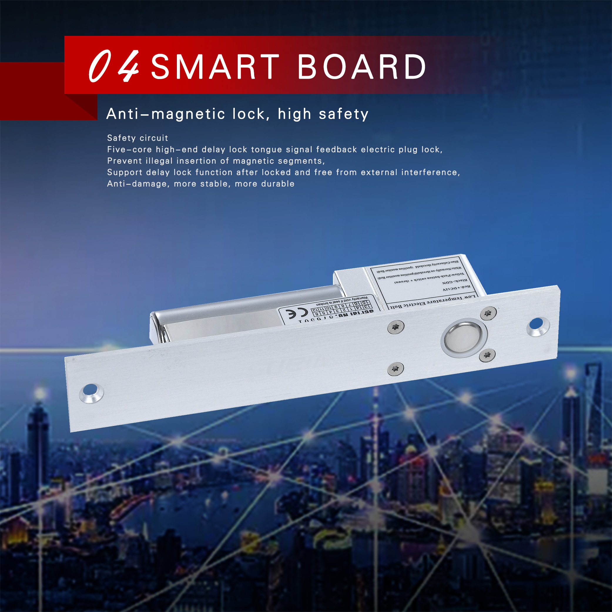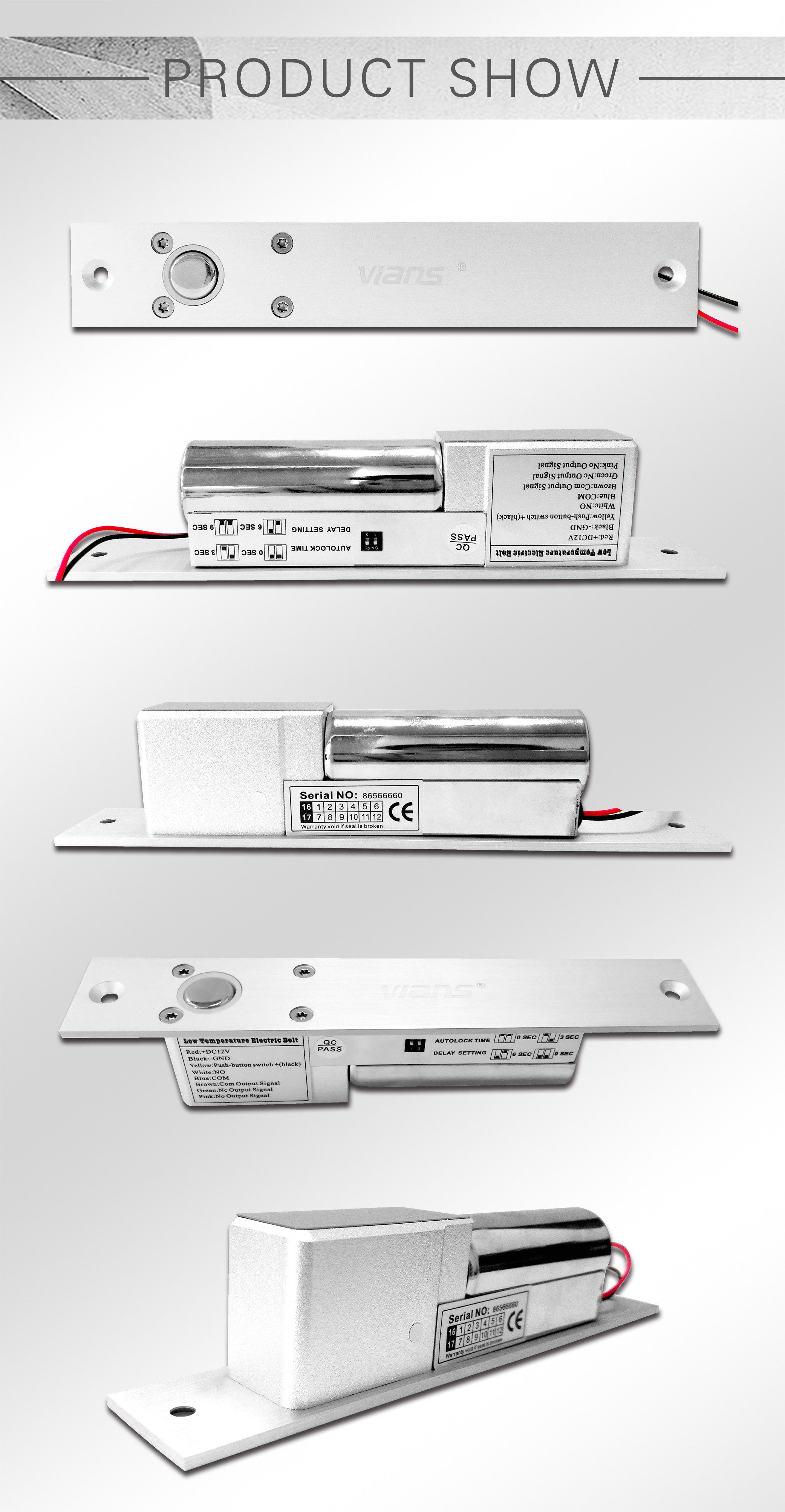 The VIANS Electric Bolt lock use the microprocessor chip to control electric circuit, so it decreases the power consumption and really has the ultralow temperature function. After 500 000 times of test, we can assure you that our locks are more stable, more environmentally friendly and durable. Electric Bolt lock was designed mainly for glass door, wooden door and metal door, it is suitable for bidirectional door and sliding door, it is also the best choice for access control automation management.