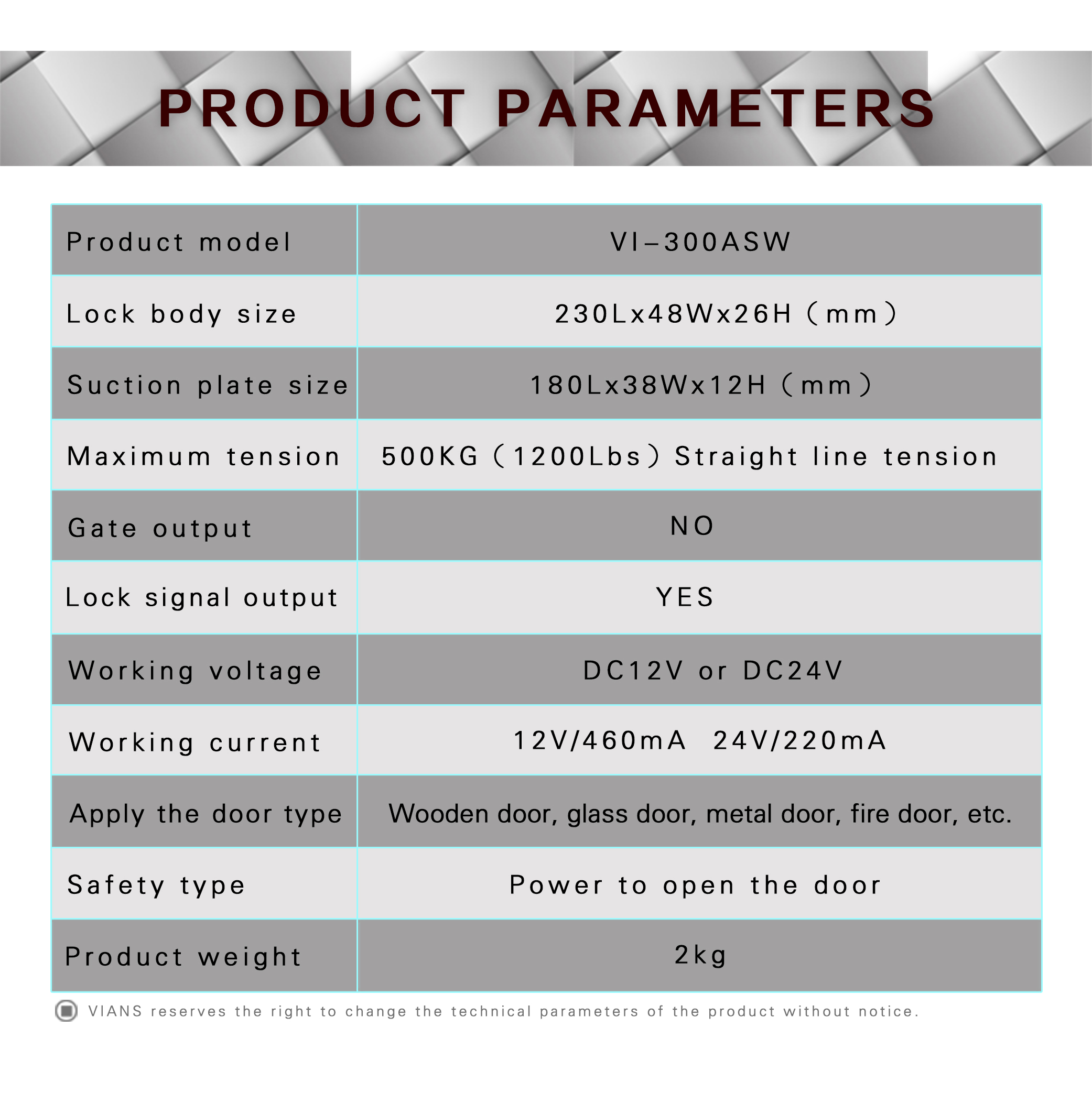 The VIANS Electromagnetic lock is using the leading production equipment and packaging technology of the international. Produced the electromagnetic lock is not only higher than similar products by more than 20% of the lock holding force, but also the antioxidant capacity of the surface of magnetic lock is reached the international advanced level. Which are widely used in airports, subways, banks, prisons, intelligent buildings.