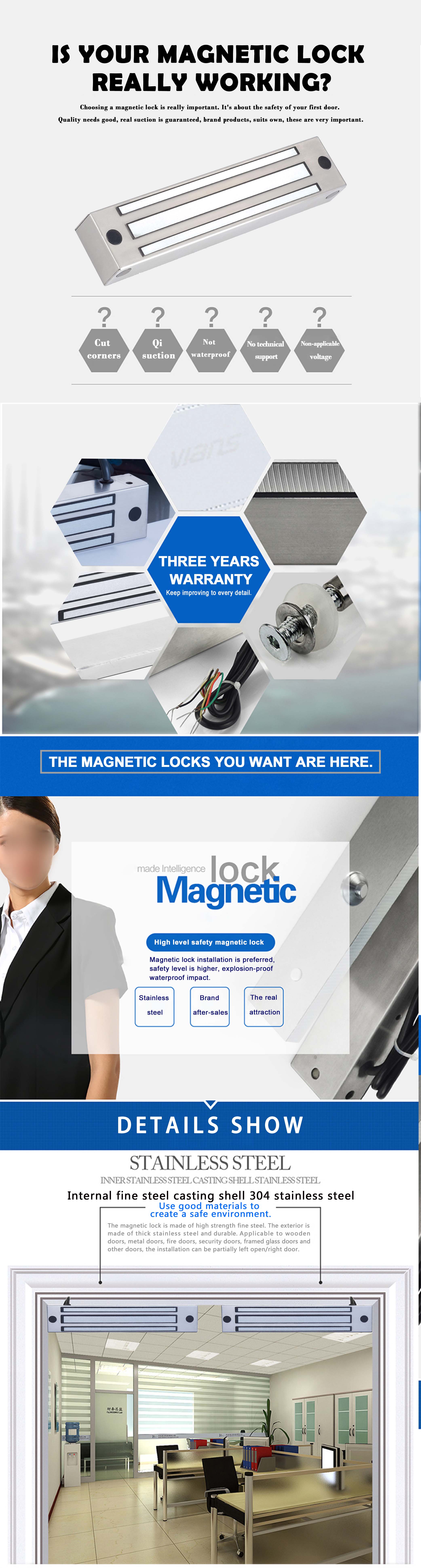 The VIANS Electromagnetic lock is using the leading production equipment and packaging technology of the international. Produced the electromagnetic lock is not only higher than similar products by more than 20% of the lock holding force, but also the antioxidant capacity of the surface of magnetic lock is reached the international advanced level. Which are widely used in airports, subways, banks, prisons, intelligent buildings.