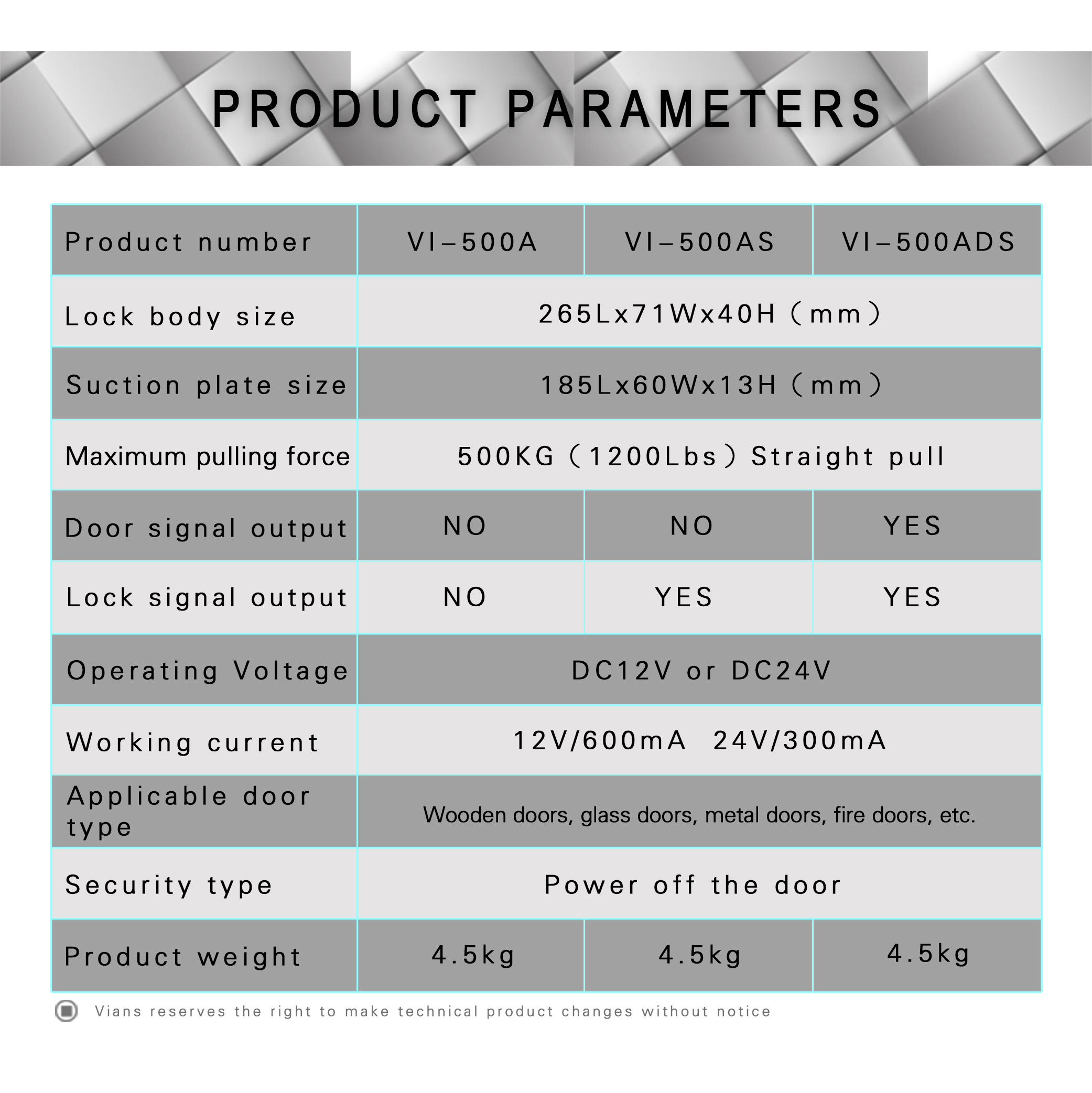 The VIANS Electromagnetic lock is using the leading production equipment and packaging technology of the international. Produced the electromagnetic lock is not only higher than similar products by more than 20% of the lock holding force, but also the antioxidant capacity of the surface of magnetic lock is reached the international advanced level. Which are widely used in airports, subways, banks, prisons, intelligent buildings.