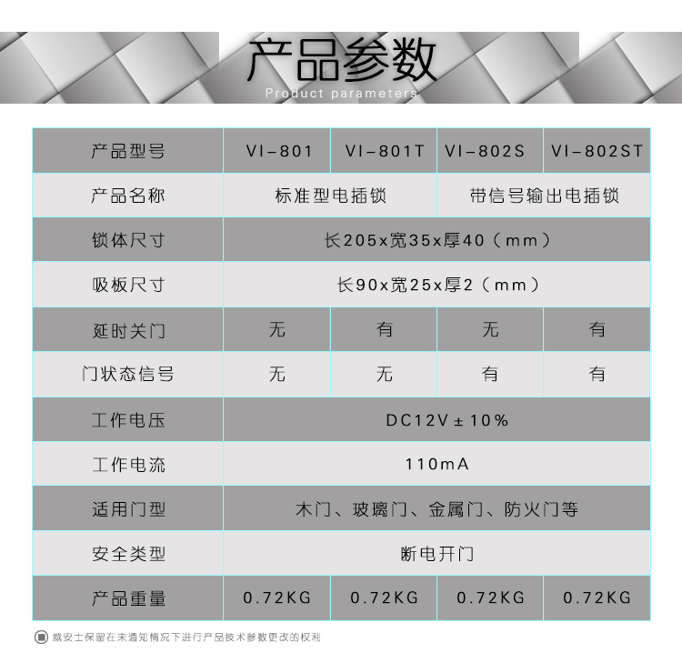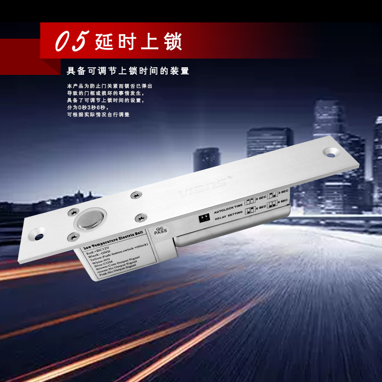 威安士电插锁采用微处理芯片控制电路,减小了电插锁功耗,具有真正意义的超低温功能,50万次的老化测试,防止机械故障,使电插锁更稳定、更环保耐用;电插锁主要针对玻璃门、木门、金属门来设计,是目前一种可控制双向平开门和推拉门的优质电动锁具,是实现门禁控制自动化管理的最佳选择。