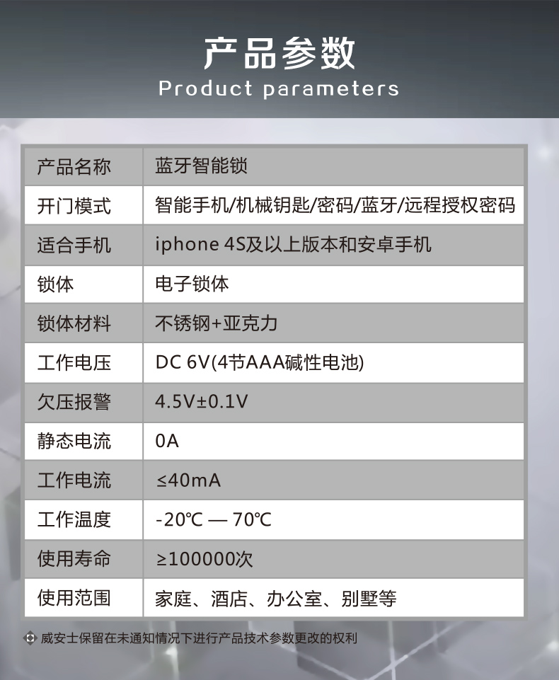 蓝牙门锁是威安士公司最新推出的一款智能手机门锁,它采用了最新的互联网技术,颠覆和超越了普通门锁和指纹密码门锁的开门方式,使用更安全可靠、更经济便利,是普通家庭和办公场所的首选产品。本产品获得了美国和中国的多项专利,并由安诚财产保险股份有限公司承保。