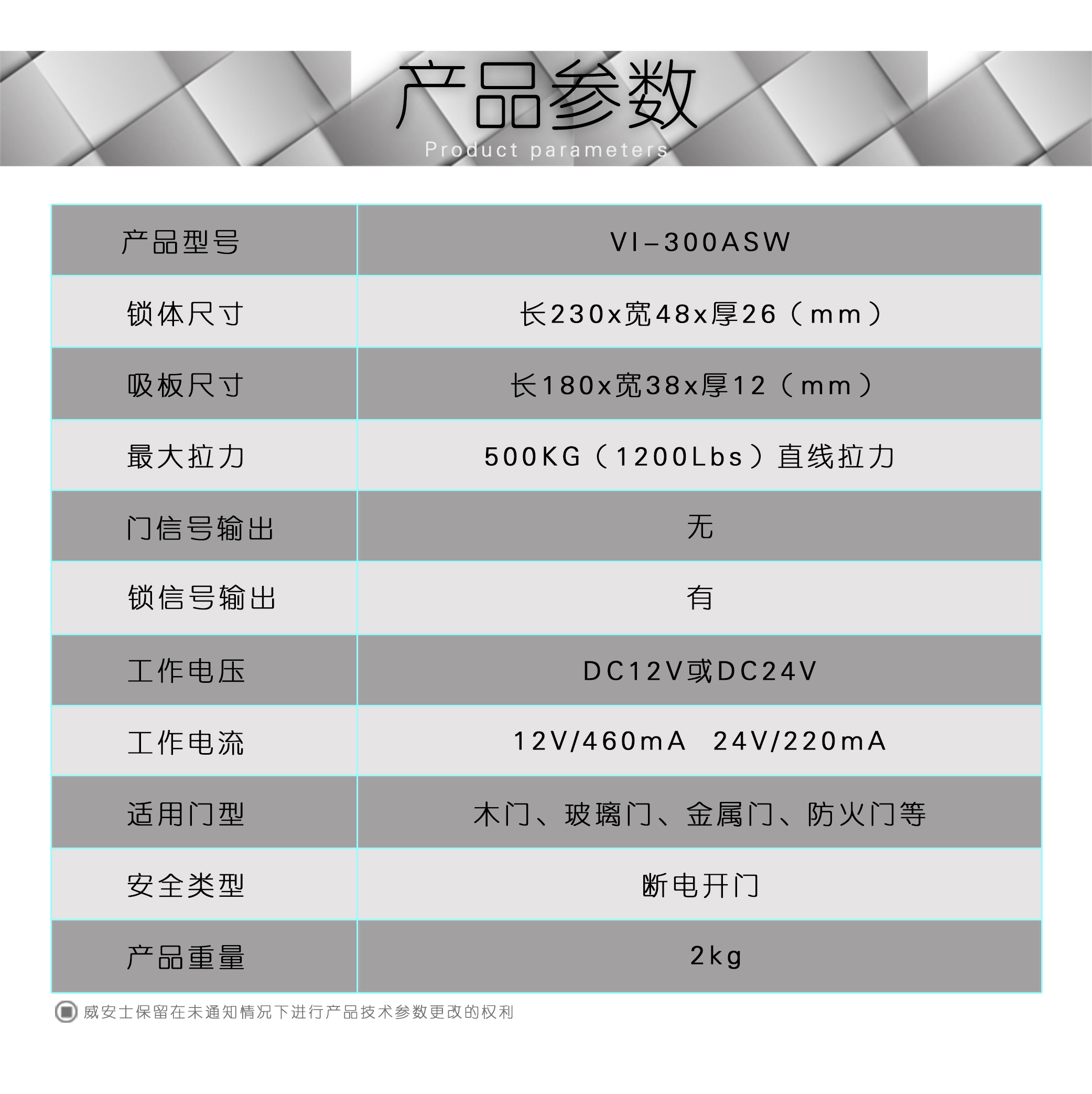 威安士磁力锁采用国际领先的生产和封装工艺,不仅使磁力锁的拉力高于同类产品20%以上,同时磁力锁表面抗氧化能力达到国际领先水平,产品现已销售到了全球八十多个国家和地区,广泛应用于机场、地铁、银行、监狱、智能大厦、智能小区等重要场所,为全球用户提供方便、快捷、智能化的出入口管理锁具,受到了用户的广泛好评和青睐。