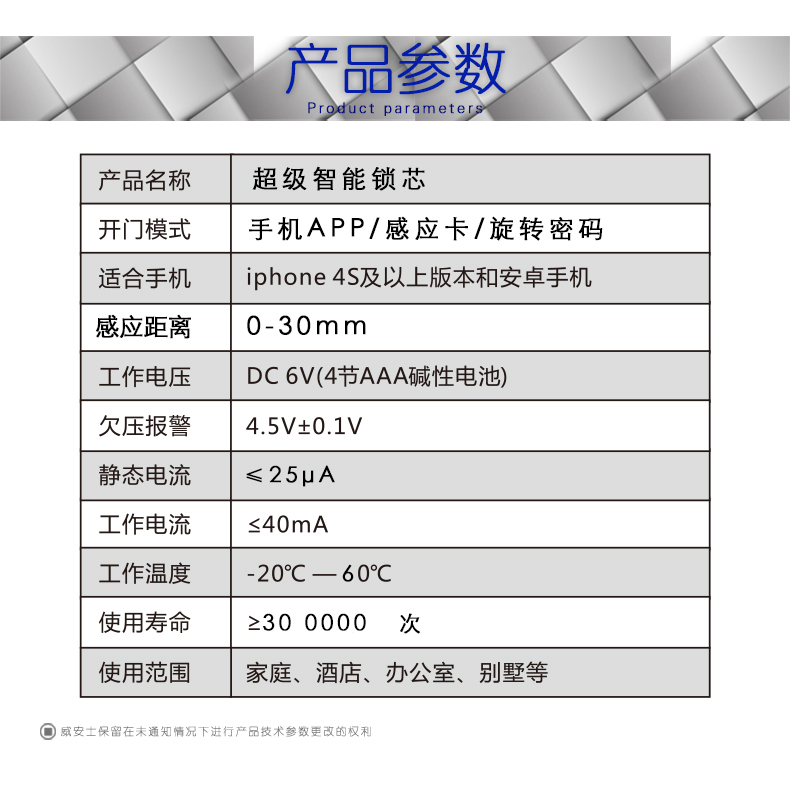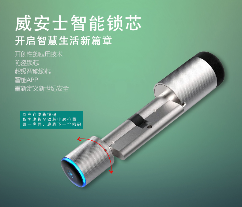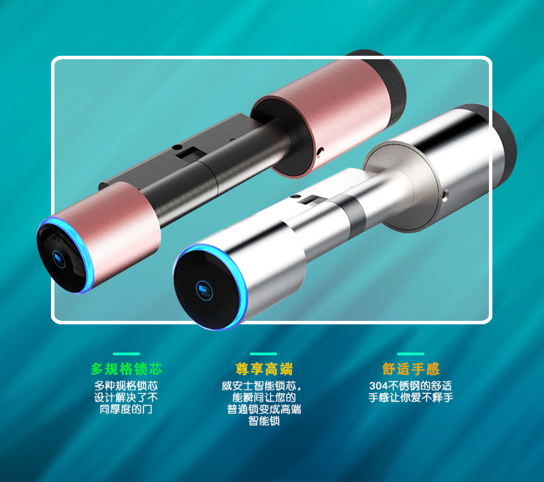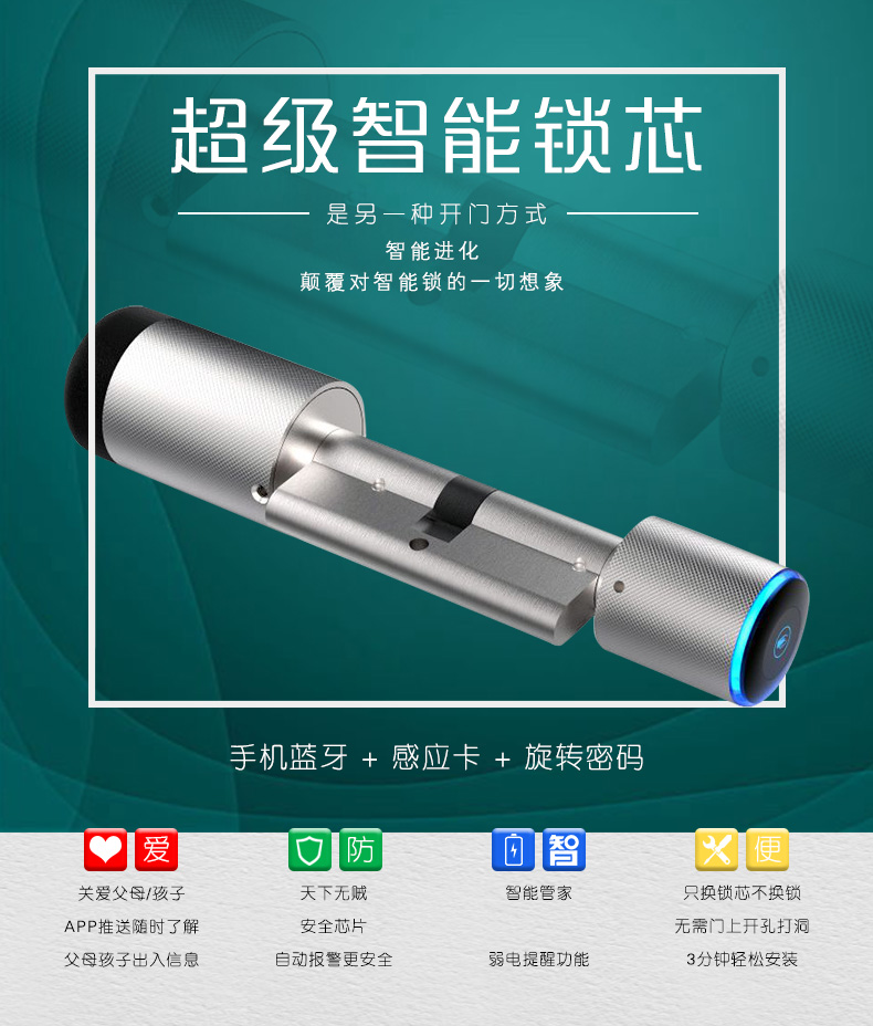 智能超级锁芯是威安士电锁和特斯联科技联合多个科研机构研发的一款跨时代的智能门锁产品,拥有全球多项产品专利。智能超级锁芯利用互联网技术将传统的机械门锁变为具有移动互联网功能的智能门锁,解决了传统的机械门锁向智能门锁的转变的难题,只需要更换锁芯立即让机械锁变成智能锁。智能超级锁芯采用更先进的AES蓝牙加密技术,让你开门更简单、更方便、更安全。