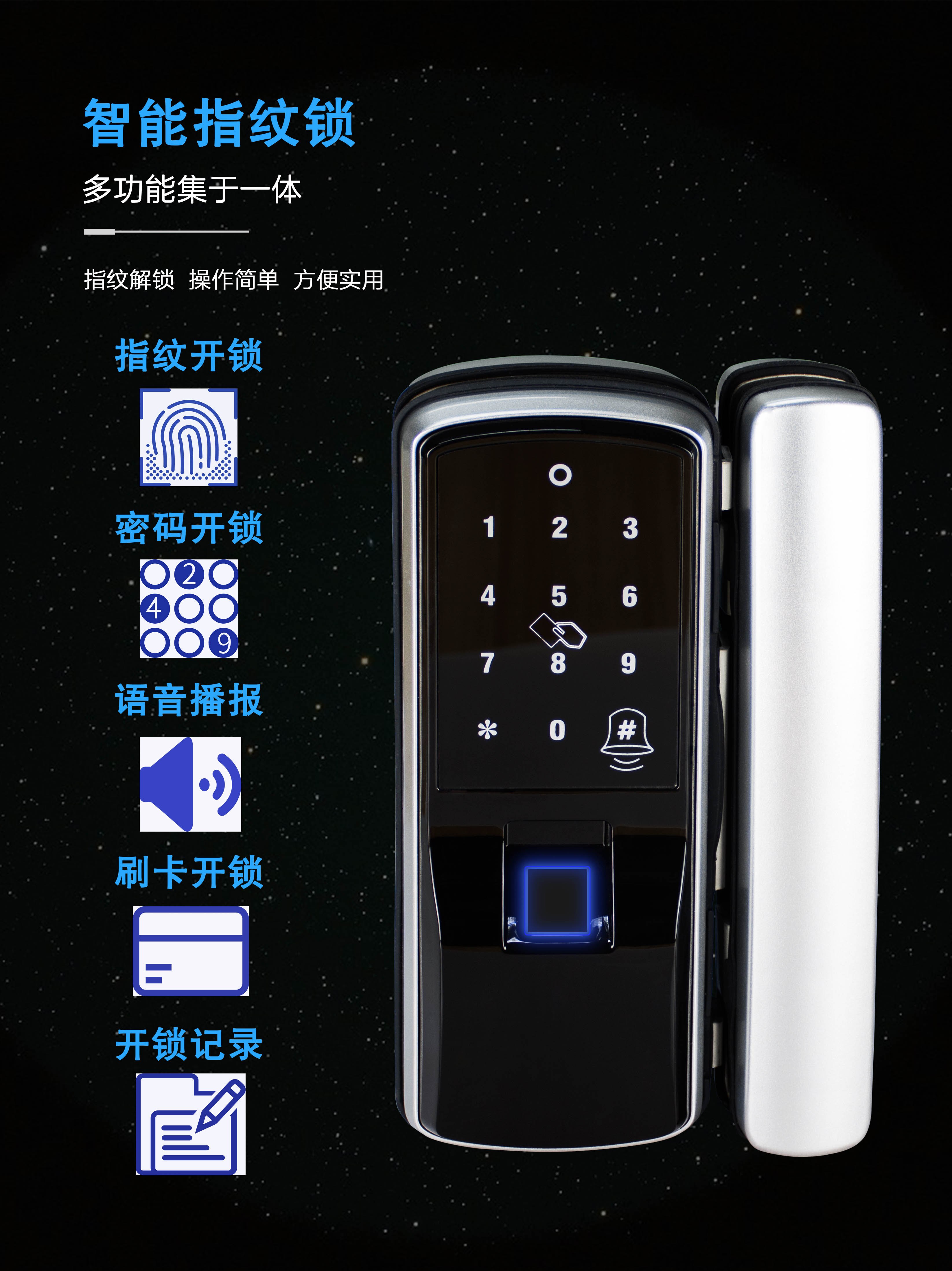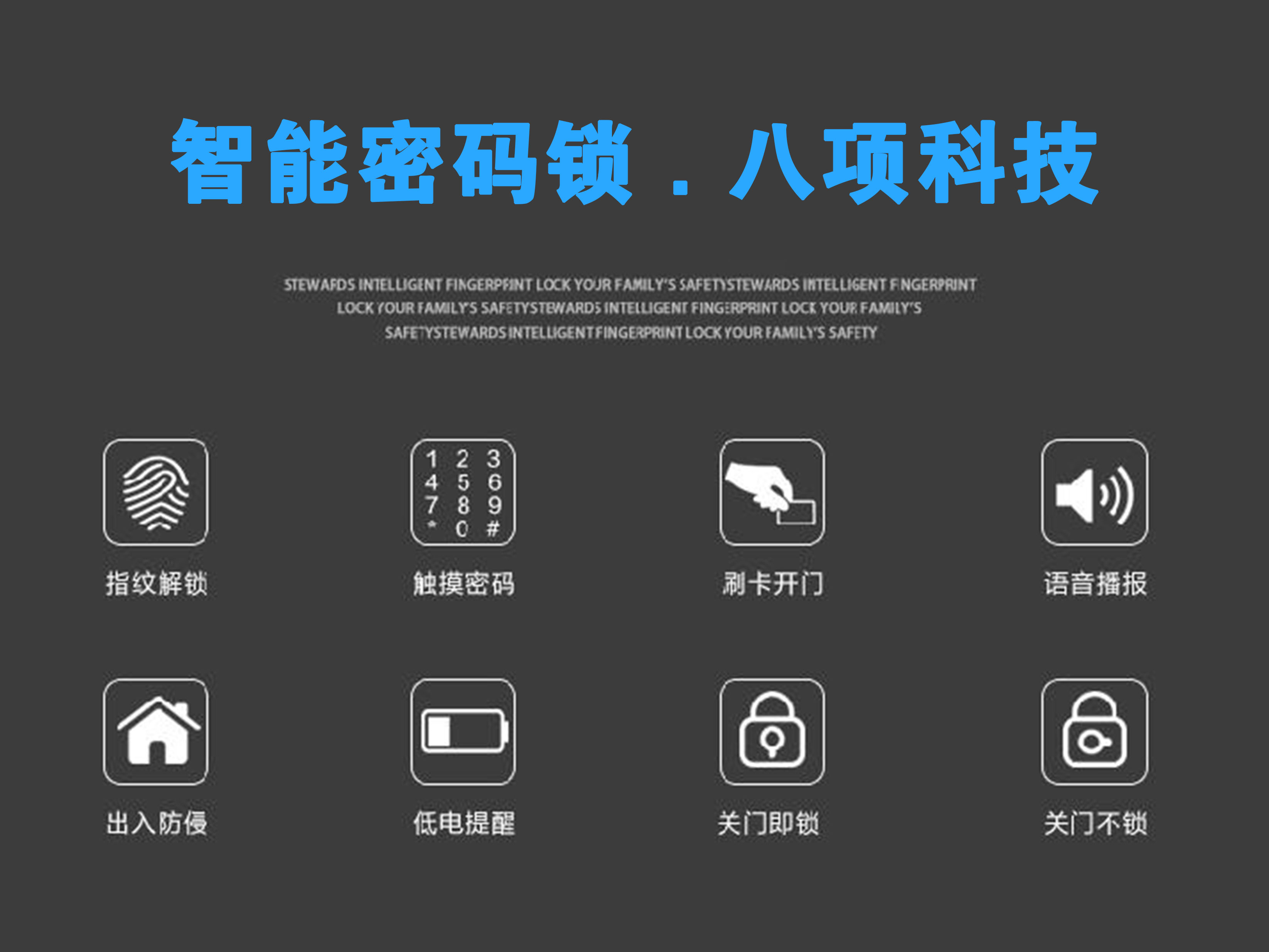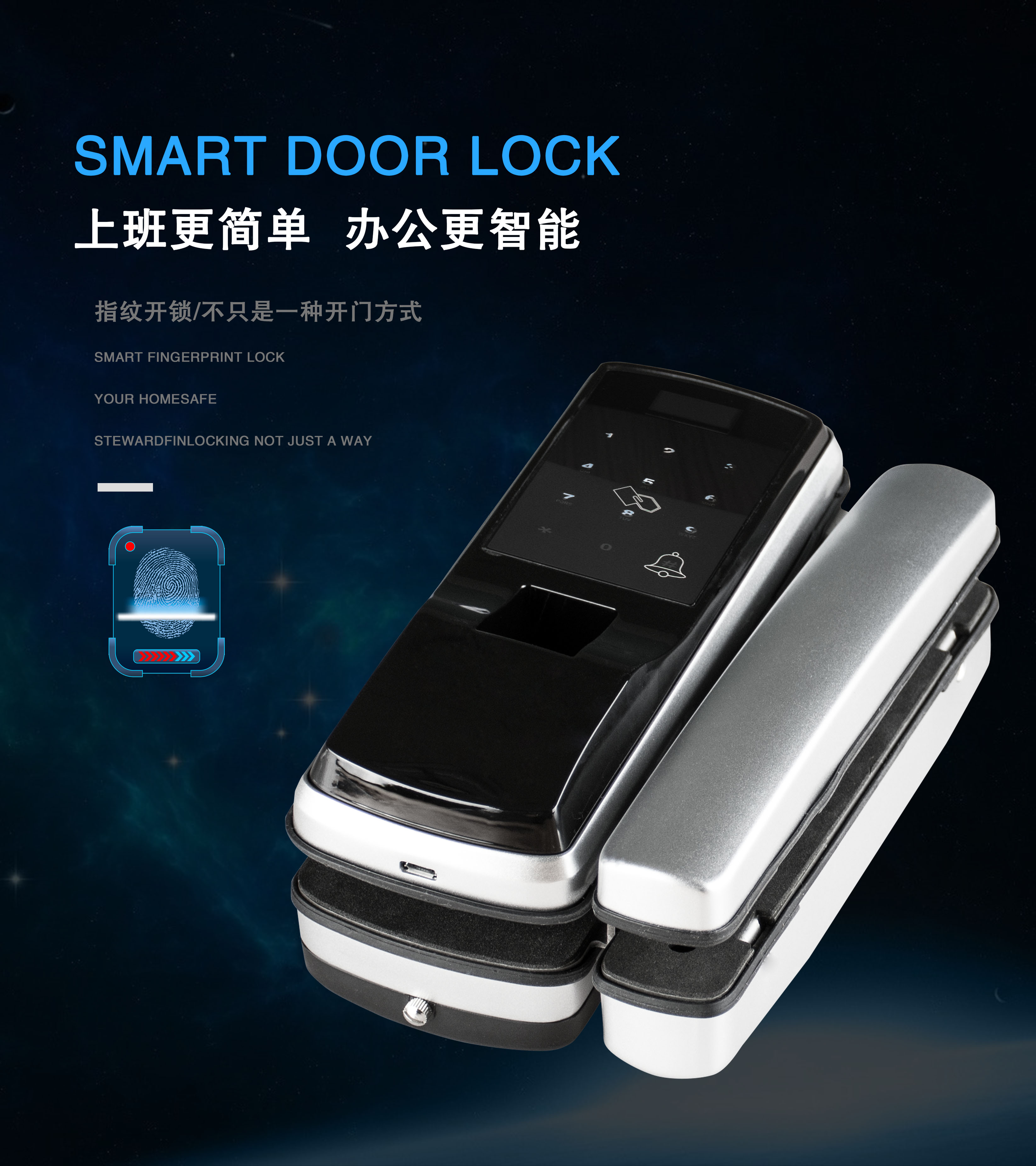 智能指纹门锁是威安士公司最新推出的一款智能指纹门锁,它采用了最新的互联网技术,颠覆和超越了普通门锁和指纹密码门锁的开门方式,使用更安全可靠、更经济便利,是普通家庭和办公场所的首选产品。本产品获得了美国和中国的多项专利,并由安诚财产保险股份有限公司承保。