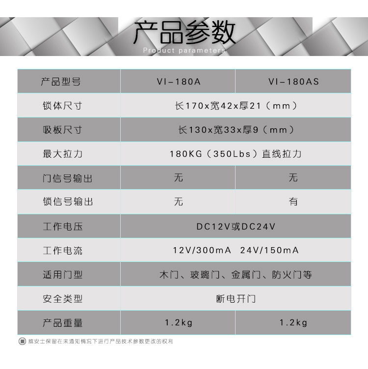 威安士磁力锁采用国际领先的生产和封装工艺,不仅使磁力锁的拉力高于同类产品20%以上,同时磁力锁表面抗氧化能力达到国际领先水平, 产品现已销售到了全球八十多个国家和地区,广泛应用于机场、地铁、银行、监狱、智能大厦、智能小区等重要场所,为全球用户提供方便、 快捷、智能化的出入口管理锁具,受到了用户的广泛好评和青睐。