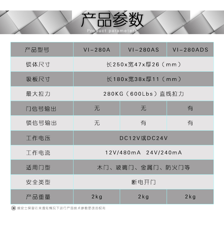 威安士磁力锁采用国际领先的生产和封装工艺,不仅使磁力锁的拉力高于同类产品20%以上,同时磁力锁表面抗氧化能力达到国际领先水平,产品现已销售到了全球八十多个国家和地区,广泛应用于机场、地铁、银行、监狱、智能大厦、智能小区等重要场所,为全球用户提供方便、快捷、智能化的出入口管理锁具,受到了用户的广泛好评和青睐。