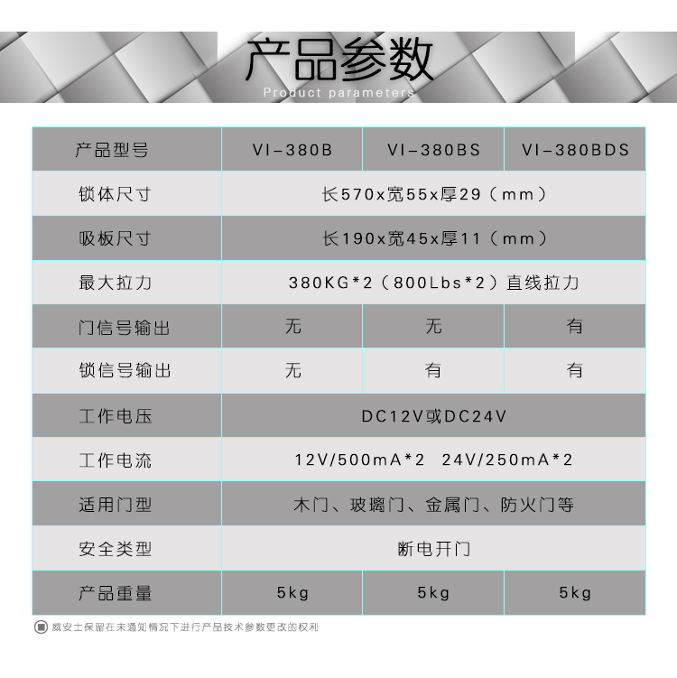 威安士磁力锁采用国际领先的生产和封装工艺,不仅使磁力锁的拉力高于同类产品20%以上,同时磁力锁表面抗氧化能力达到国际领先水平,产品现已销售到了全球八十多个国家和地区,广泛应用于机场、地铁、银行、监狱、智能大厦、智能小区等重要场所,为全球用户提供方便、快捷、智能化的出入口管理锁具,受到了用户的广泛好评和青睐。