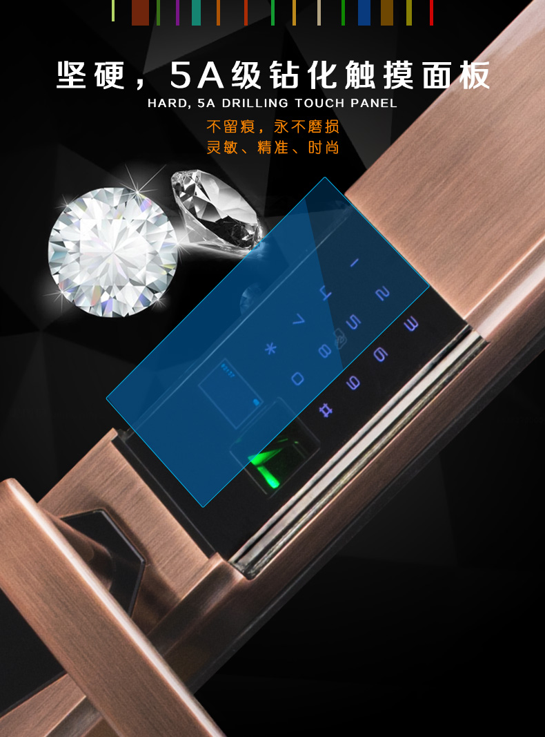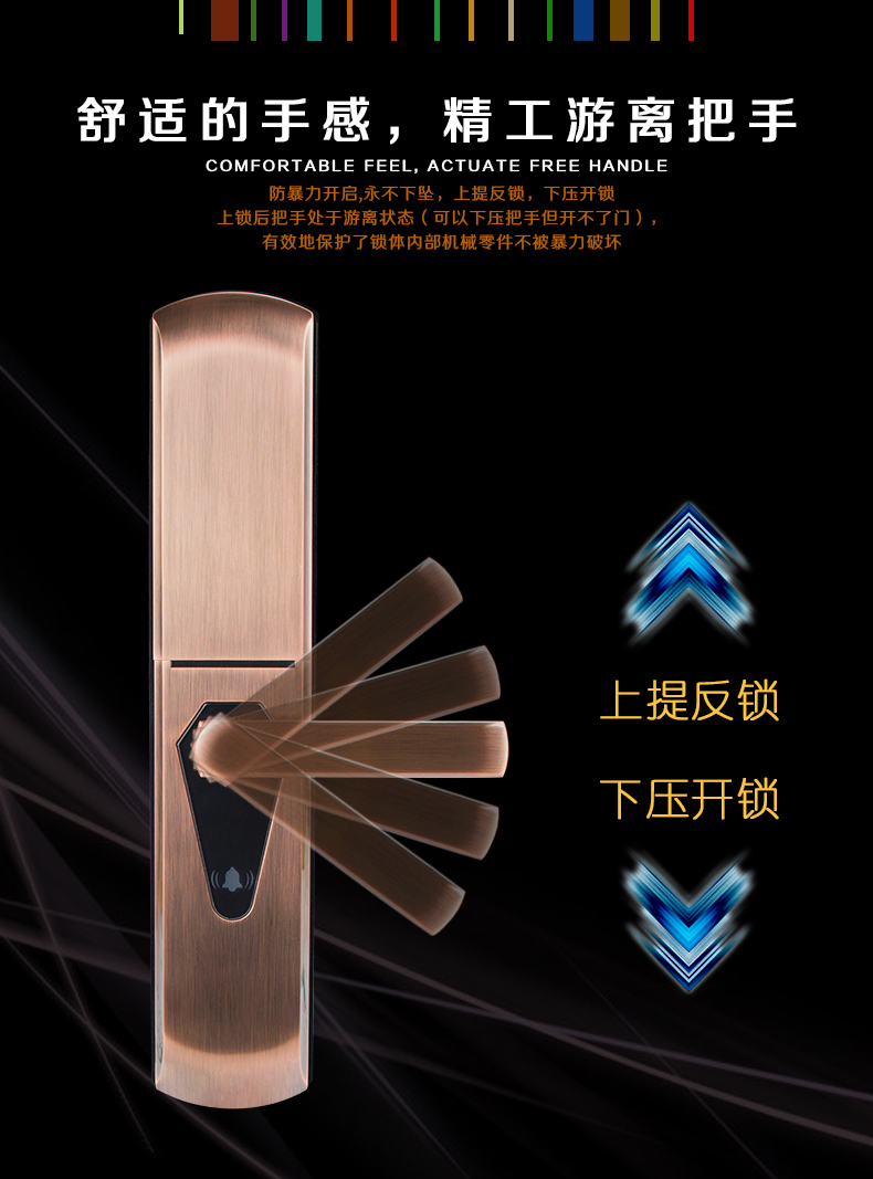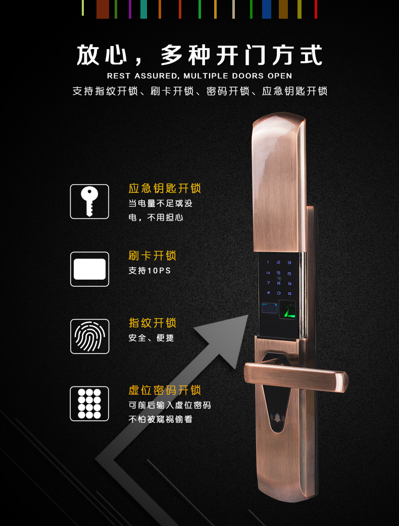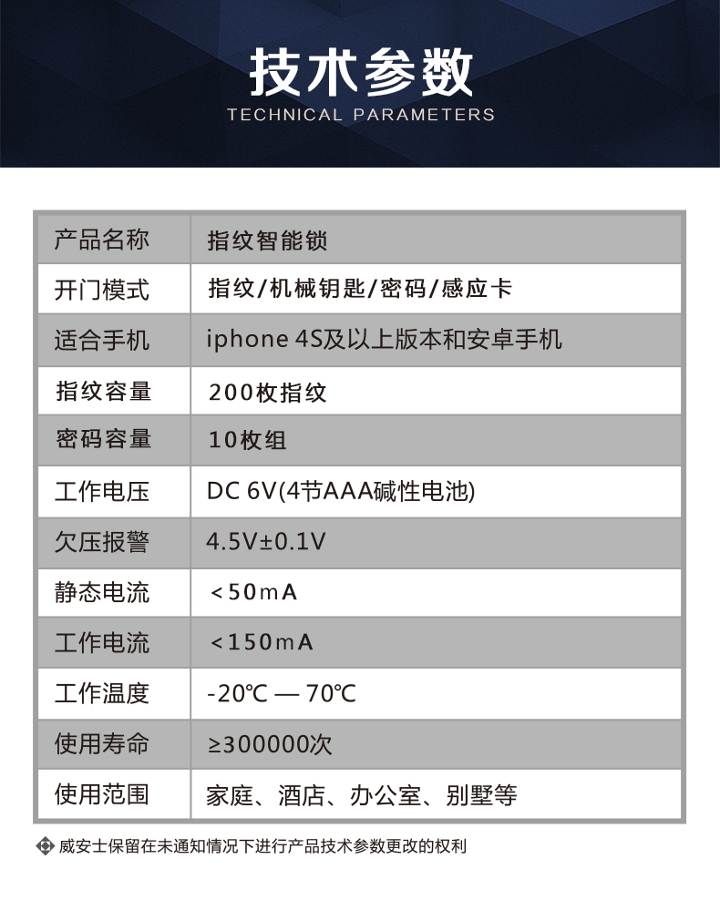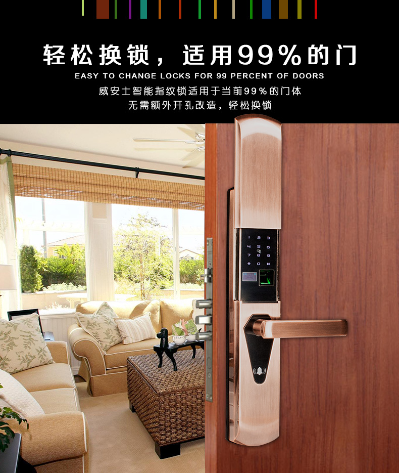 智能指纹门锁是威安士公司最新推出的一款智能指纹门锁,它采用了最新的互联网技术,颠覆和超越了普通门锁和指纹密码门锁的开门方式,使用更安全可靠、更经济便利,是普通家庭和办公场所的首选产品。本产品获得了美国和中国的多项专利,并由安诚财产保险股份有限公司承保。