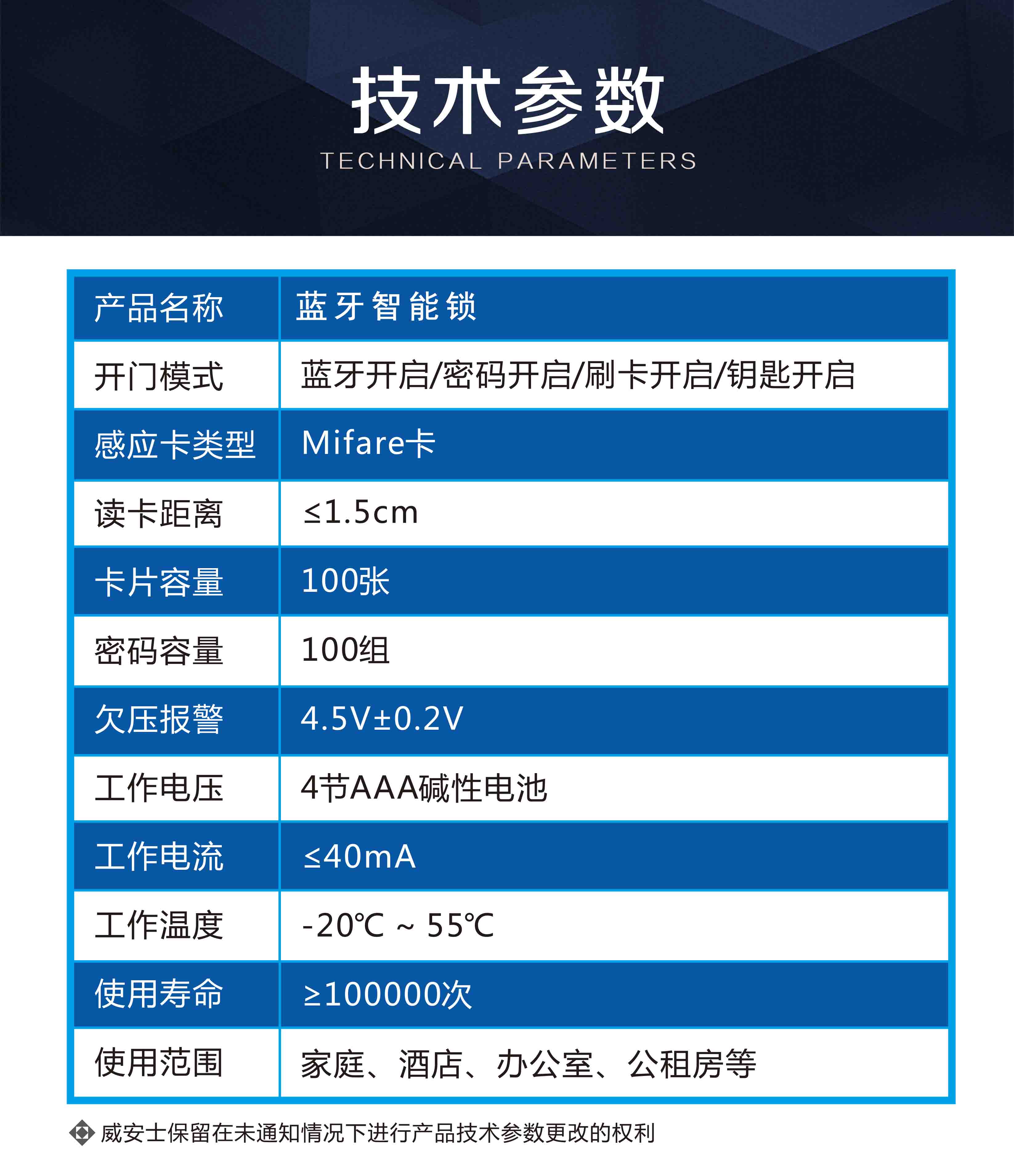 蓝牙智能锁是威安士公司最新推出的一款智能门锁,它采用了最新的互联网技术,颠覆和超越了普通门锁和蓝牙密码门锁的开门方式,使用更安全可靠、更经济便利,是普通家庭和办公场所的首选产品。本产品获得了美国和中国的多项专利,并由安诚财产保险股份有限公司承保。