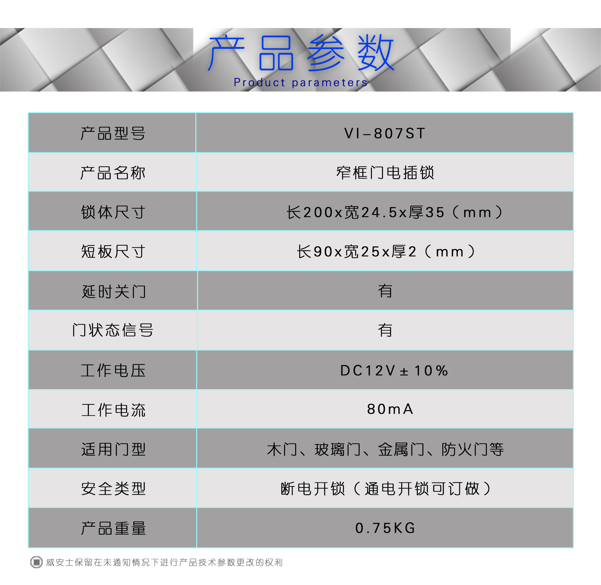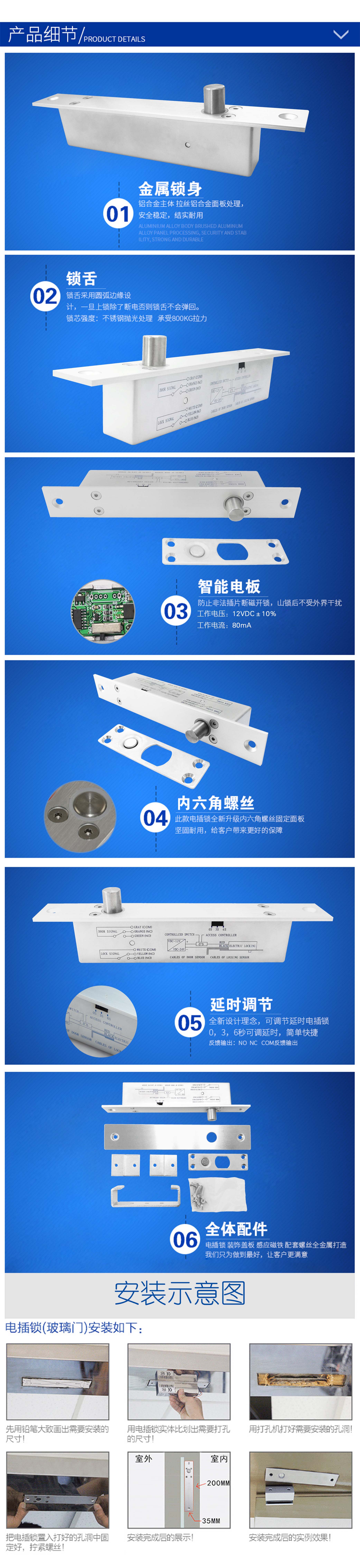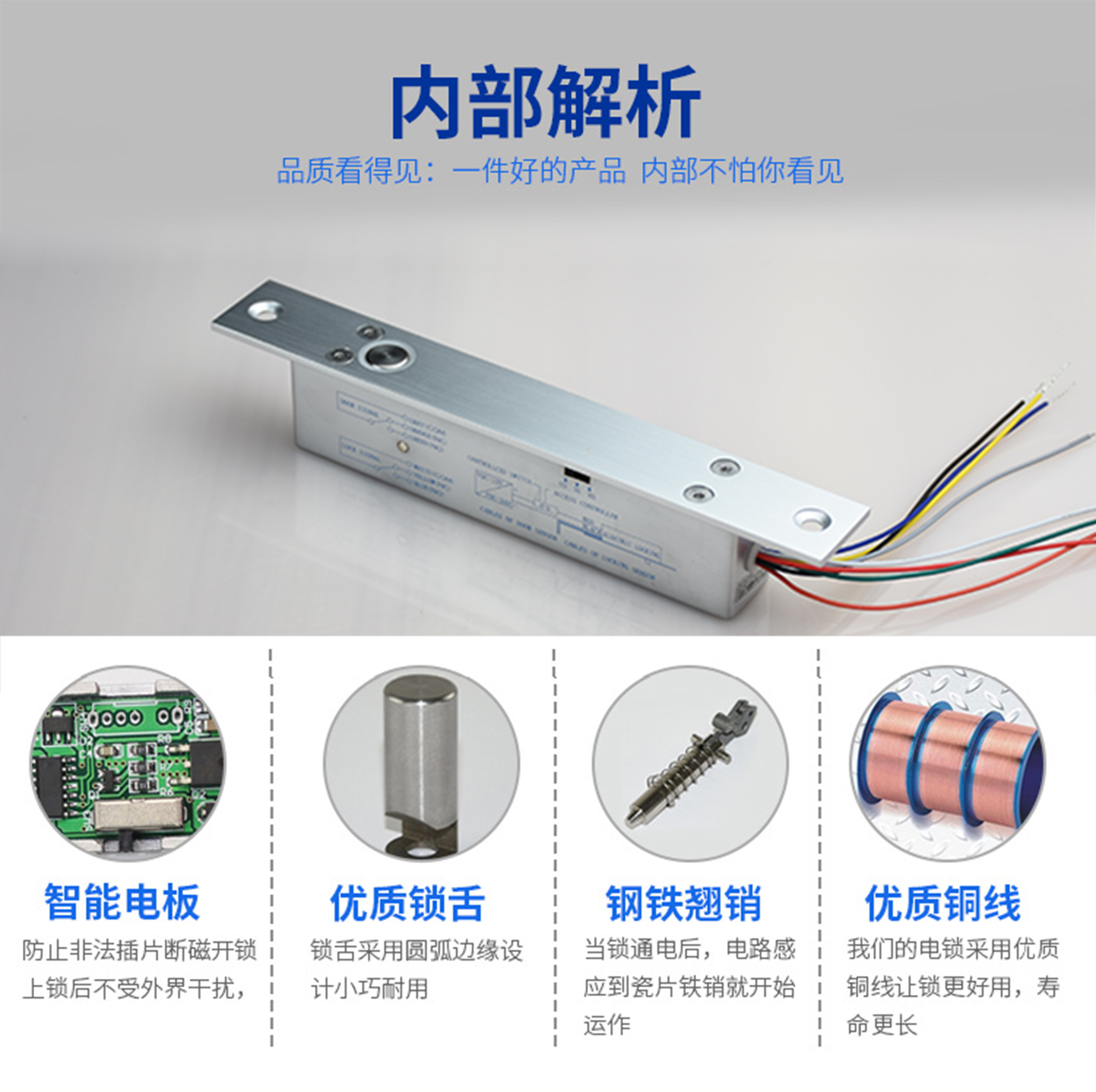 威安士电插锁采用微处理芯片控制电路,减小了电插锁功耗,具有真正意义的超低温功能,50万次的老化测试,防止机械故障,使电插锁更稳定、更环保耐用;电插锁主要针对玻璃门、木门、金属门来设计,是目前一种可控制双向平开门和推拉门的优质电动锁具,是实现门禁控制自动化管理的最佳选择。